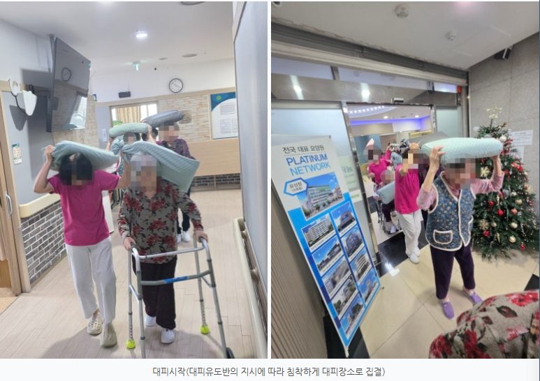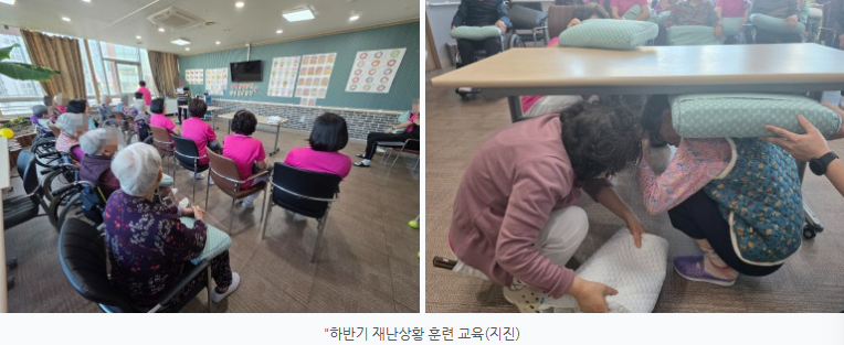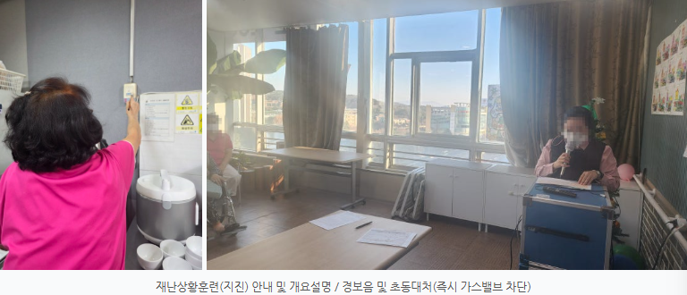 ♡ 2025년 하반기 재난상황훈련(지진-12.18) 관리자 2025-12-26 10:54 어르신의 안전을 최우선으로 생각합니다.최근 잦아지는 자연재해 속에서어르신들의 안전을 지키기 위한 준비의 중요성이더욱 강조되고 있습니다.플래티늄 유성 요양원은 예상치 못한지진 발생 상황에 대비하여 재난상황대응 훈련을 실시하였습니다.이번 훈련을 실제 상황을 가정하여어르신과 종사자 모두가 침착하고안전하게 대응할 수 있도록진행되었습니다. ✔️ 지진 발생 시 행동요령 숙지훈련에서는 지진 발생 시 가장 중요한행동요령을 중심으로 안내하였습니다.* 지진 발생 즉시 탁자 아래 또는 안전한 공간으로 대피* 넘어질 수 있는 물건에서 몸과 머리 보호* 엘리베이터 사용 금지 및 계단 이용* 흔들림이 멈춘 후 질서 있는 대피 ✔️ 종사자 비상 대응 체계 점검플래티늄 유성 요양원 종사자들은1) 어르신 안전 확보2) 비상 연락 체계 확인3) 대피 동선 점검4) 2차 사고 예방 조치등을 실제 상황처럼 점검하며, 위기 상황에서도신속하고 체계적인 대응이가능하도록 훈련하였습니다.✔️ 보호자님께 드리는 약속플래티늄 유성 요양원은어르신의 일상 돌봄뿐만 아니라 재난상황에서도 안전한 생활공간을 유지하기 위해정기적인 교육과 훈련을 실시하고 있습니다.앞으로도 어르신 한 분 한 분의 안전을최우선으로 생각하며,보호자님게서 안심할 수 있는 요양원이 되겠습니다. 다음글 ♡ 2025년 12월 5주 식단안내(12월29일~1월4일) 이전글 ♡ 2025년 12월 4주 식단안내(12월22일~12월28일) 목록