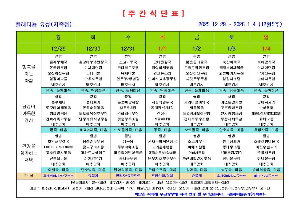 ♡ 2025년 12월 5주 식단안내(12월29일~1월4일) 관리자 2025-12-26 12:59 ♡ 2025년 12월 5주 식단안내(12월29일~1월4일) 다음글 ♡ 2025년 제4차 운영위원회 개최(12.23) 이전글 ♡ 2025년 하반기 재난상황훈련(지진-12.18) 목록