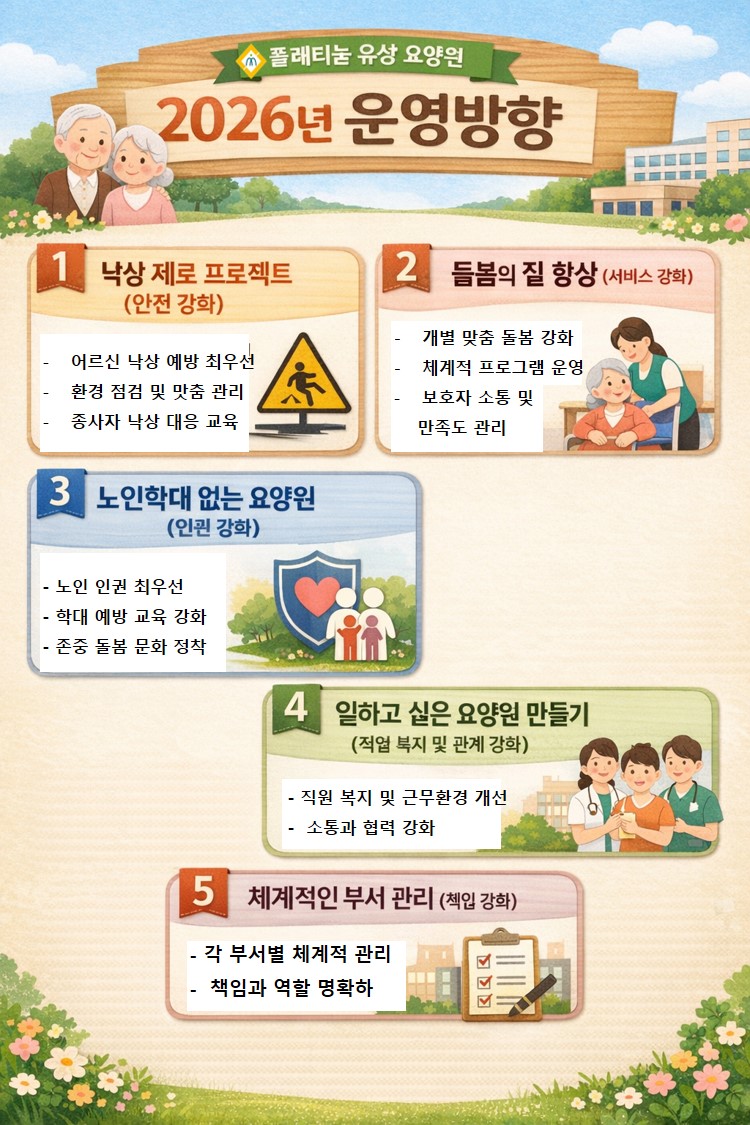 ♡ 2026년 플래티늄 유성 운영방향 안내 관리자 2025-12-30 15:44 플래티늄 유성 요양원2026년 운영방향 안내플래티늄 유성 요양원은다가오는 2026년, 어르신의 안전과존엄을 최우선으로 생각하며더 나은 돌봄 환경과 신뢰받는 요양원을만들기 위한운영방향을 아래와 같이 설정하였습니다.1. 낙상 제로 프로젝트-안전 강화어르신의 일상 속 가장 큰 위험 요소인낙상예방을 최우선 과제로 삼아'낙상 제로 프로젝트'를 지속 추진합니다.✔️ 생활공간 환경 점검 강화✔️ 어르신 개별 낙상 위험도 평가 및 맞춤관리✔️ 종사자 낙상 예방 및 대응 교육 강화작은 위험 요소도 놓치지 않는 세심한관리로어르신이 안심하고 생활하실 수 있는환경을 만들어가겠습니다.2. 돌봄의 질 향상-서비스 강화어르신 한 분 한 분의 삶을 존중하는개별 맞춤 돌봄 서비스를 강화합니다.✔️ 신체, 인지, 정서 프로그램의 체계적운영✔️ 돌봄 서비스 표준화 및 질 관리✔️ 보호자와의 의사 소통 강화 및 만족도 관리'돌봄' 그 이상의 가치를 제공하는요양원이 되겠습니다.3. 노인학대 없는 요양원- 인권 강화플래티늄 유성 요양원은노인 인권 존중을 기본 원칙으로 삼고있습니다.✔️ 전 직원 노인 인권 및 학대 예방 교육정기 실시✔️ 학대 예방 지침 및 신고 체계 확립✔️ 존중과 배려가 살아있는 돌봄 문화 장착어르신이 존중받고 보호받는 공간을만들어가겠습니다.4. 일하고 싶은 요양원 만들기-직원 복지 및 관계 강화좋은 돌봄은 행복한 종사자에서시작됩니다.✔️ 근무 환경 및 직원 복지 개선✔️ 직원 간 소통과 협력 문화 강화✔️ 안정적이고 존중받는 직장 문화 조성직원이 자부심을 가지고 일할 수 있는요양원을 만들어그 마음이 어르신 돌봄으로 이어지도록하겠습니다.5. 체계적인 부서 관리-책임 강화각 부서의 역할과 책임을 명확히 하여보다 체계적이고 안정적인 운영을실현합니다.✔️ 부서별 업무 체계 정비✔️ 역할과 책임 명확화✔️ 지속적인 점검과 개선을 통한 운영 내실화플래티늄 유성 요양원은안전, 돌봄, 인권, 직원, 책임경영을핵심 가치로2026년에도 변함없이 어르신과 보호자곁을 지키겠습니다.앞으로도 많은 관심과 신뢰부탁드립니다.감사합니다. 다음글 ♡ 2025년 12월 마지막 주 보호자님께 드리는 감사의 인사 이전글 ♡ 2025년 제4차 운영위원회 개최(12.23) 목록