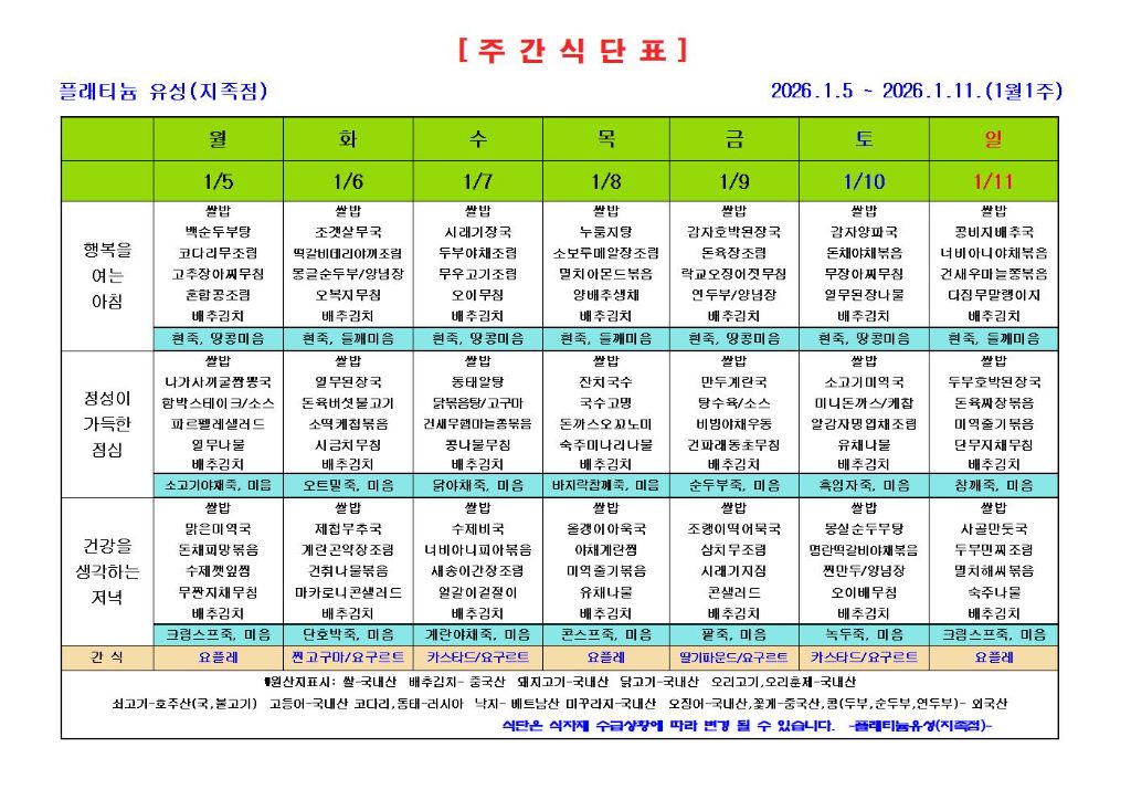 ♡ 2026년 1월 1주 식단안내(1월5일~1월11일) 관리자 2025-12-31 17:26 ♡ 2026년 1월 1주 식단안내(1월5일~1월11일) 다음글 ♡ 2025년 12월 프로그램 안내 이전글 ♡ 2025년 한 해를 마무리 하며 "종무식" 목록