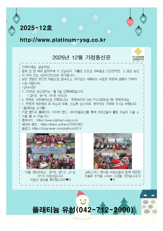 ♡ 2025년 12월 가정통신문 관리자 2026-01-02 10:37 ♡ 2025년 12월 가정통신문 다음글 ♡ 2026년 플래티늄 유성 예산(안) 공고 이전글 ♡ 2025년 12월 프로그램 안내 목록