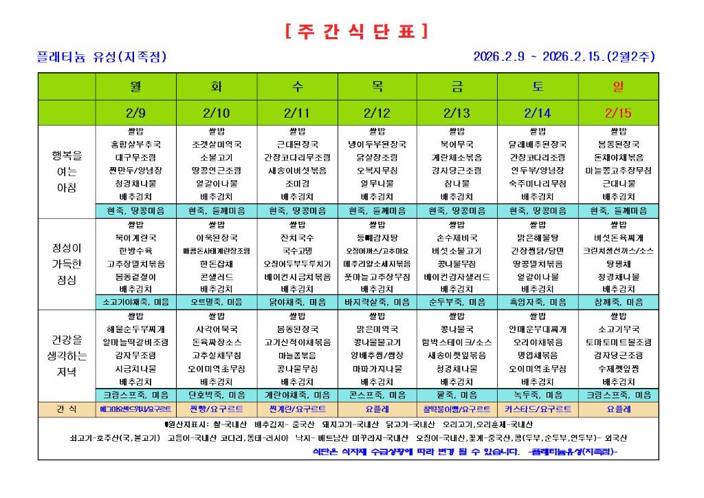 ♡ 2026년 2월 2주 식단안내(2월9일~2월15일) 관리자 2026-02-04 10:14 ♡ 2026년 2월 2주 식단안내(2월9일~2월15일) 다음글 ♡ 2026년 설 명절 면회, 외출, 외박 수칙 안내 이전글 ♥ 2026년 (1)월 프로그램 안내 목록