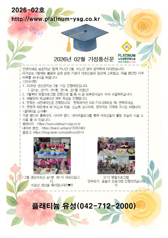 ♡ 2026년 2월 가정통신문 관리자 2026-02-26 15:30 행복을 전하는 플래티늄 유성(지족점)입니다.가정통신문 2026-2월호 안내입니다.매 월 플래티늄 유성(지족점)에서는보호자님의 알권리 보장을 위한 가정통신문을 발송하고 있습니다.어르신들의 궁금한 사항은밴드와 통신문발송, 홈페이지 및 블로그 등 다양한 방법을 통하여소통하고 있습니다.계속적으로 보호자님께어르신들의 소식을 전할 수 있도록플래티늄 유성(지족점)점은 노력하겠습니다.♡ 2월 가정통신문 ♡ 3월 안내사항1. 3월 생신잔치 안내ㅇ 일정: 3월 13일(금)ㅇ 대상어르신: 5명 (함께 축하해주세요.)2. 맞춤형프로그램 운영안내ㅇ 인지, 음악, 신체활동 프로그램 주 4회 진행ㅇ 외부강사 프로그램 (음악교실.레크레이션)진행 예정3. 건강관리 안내ㅇ 혈압, 혈당 체크 및 건강상태수시 모니터링ㅇ 환절기 감기 및 호흡기 질환예방을 위해 위생관리 강화4. 면회안내ㅇ 면회는 사전 예약제로운영됩니다.ㅇ 방문 시 마스크 착용 및 손소독부탁드립니다.5. 보호자 협조사항ㅇ 개인 물품에는 반드시 성함을기재해 주세요ㅇ 어르신 의류는 환절기용으로교체 부탁드립니다.🌺 플래티늄 유성 요양원 소식✔️ 2월 생신잔치 진행(2/8)✔️ 설명절행사 및 만두빚기 프로그램진행✔️ 음악 신체활동 프로그램 활발히 운영중어르신들의 활동 모습은 홈페이지 및블로그를 통해 확인하실수 있습니다.(홈페이지)https://www.platinum-ys.co.kr(블로그)https://blog.naver.com/platinum2014 (네이버밴드)https://band.us/band/70767462 항상 저희 요양원을 믿고 함께해 주셔서감사합니다.보호자님의 가정에 건강과 행복이가득하시길 바랍니다. 다음글 ♡ 2026년 2월 프로그램 안내 이전글 ♡ 2026년 3월 1주 식단안내(3월2일~3월8일) 목록
